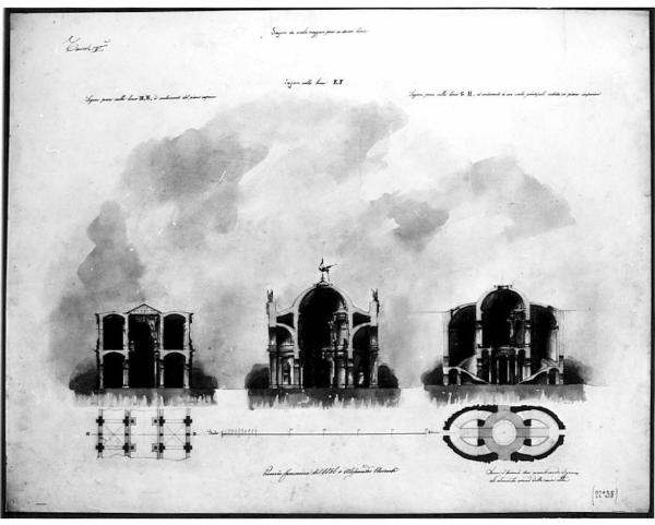 - NOTIZIE STORICO CRITICHE E' la prima delle sette tavole presentate da Alessandro Arienti, allievo dell'Accademia, al Concorso Canonica del 1856. Al concorso parteciparono 3 concorrenti (Programma del Concorso in "Atti", 855, p.62). La giuria assegnò il premio ad Arienti nonostante la "...pianta capricciosa...lo stile architettonico peccante al sontuoso e in contraddizione con la natura dell'edificio". (Giudizi in "Atti" 1856, p.38-39). Arienti ottenne un premio di seconda classe per la copia di una trabeazione ionica nel 1851.