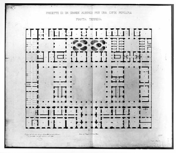 Un grande albergo per una città popolosa capace di 250 camere da letto con 50 salotti. architettura: albergo (pianta)