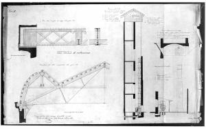 La tavola contiene sei particolari costruttivi, con murature sezionate campite in acquerello grigio, parti in ferro in acqu. azzurro e strutture lignee in acquarello beige. In alto a sin. trave in ferro di sostegno del solaio; in basso a sin. armatura del tetto; a destra sezione della colonna idraulica, sezione del locale della caldaia.
