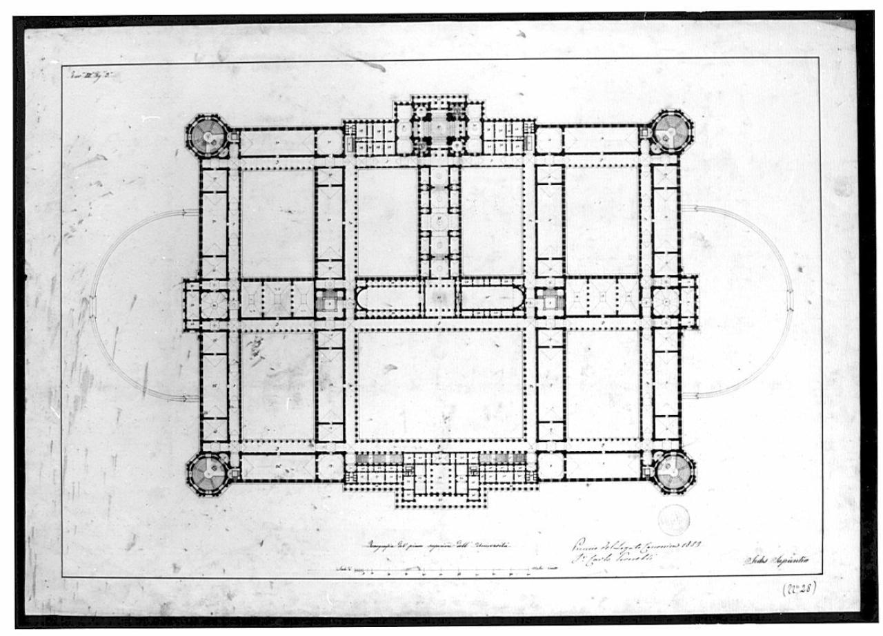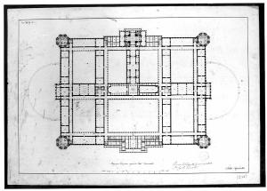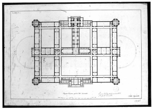 Pianta di edificio con murature campite in china nera. Edificio simmetrico rettangolare con cortili interni; sugli spigoli corpi ottagonali contenenti le scale. Sul lato inferiore e sul lato superiore vi sono corpi rettangolari sporgenti rispetto al perimetro dell'edificio. Sui lati ds e sin. al centro, due semicerchi delimitano due aree scoperte.