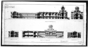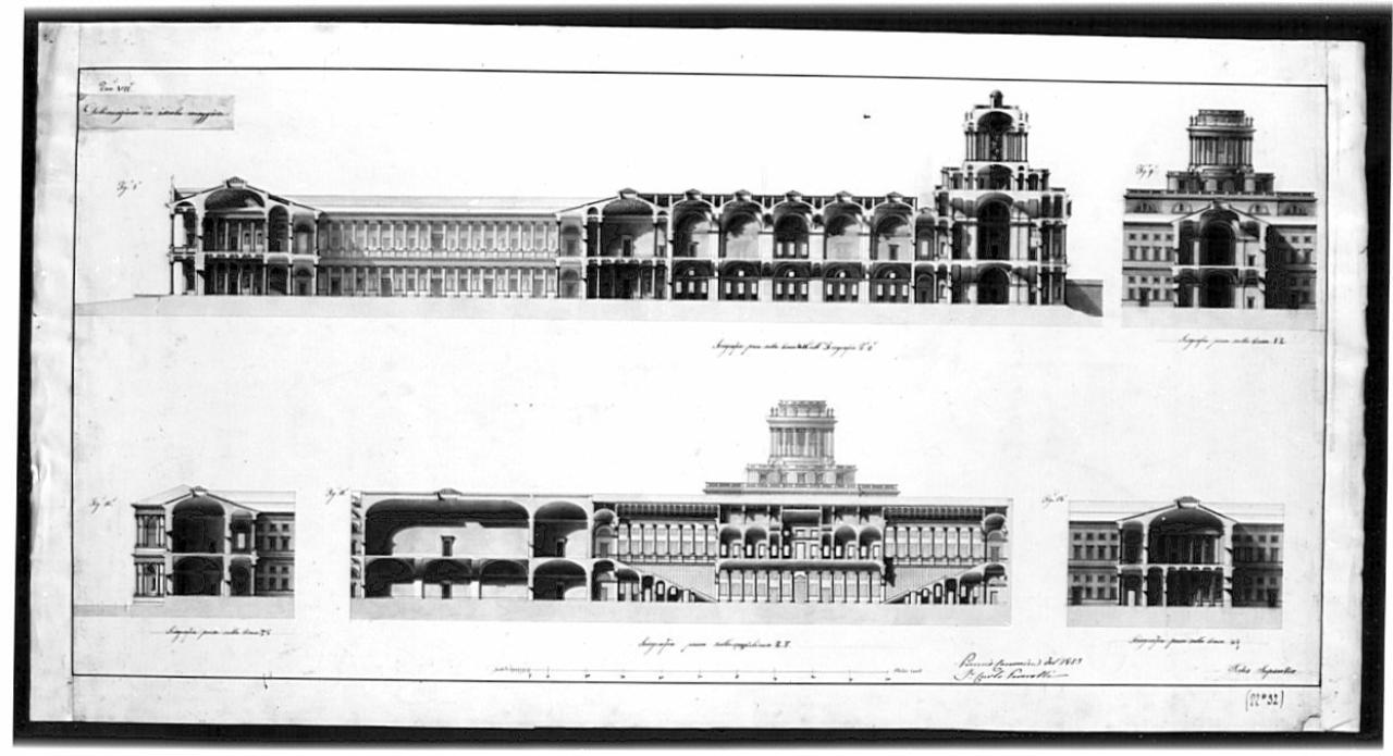 La tavola contiene: in alto due sezioni di parti di edificio a china e bistro con ombreggiature grigio scuro e parti sezionati campite in acquarello rosa. A sin.: sezione con vista del cortile con colonnato al piano terra e al piano superiore. Sezione dell'interno dell'edificio: sequenza di locali con copertura piana al piano terra e locali con copertura a volta con lucernario al piano sup.; a ds sezione di un corpo più alto con tamburo colonnato. In basso tre sezioni. Al centro vasta scala gradonata. Vista sul fondo del corpo più alto con tamburo colonnato.
