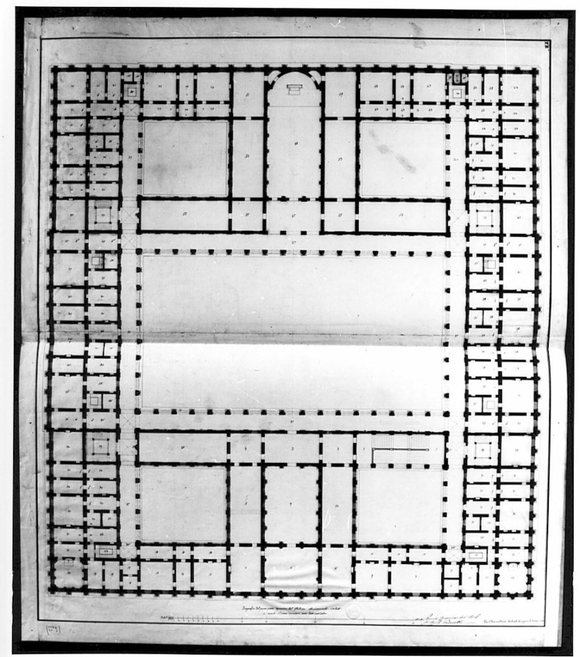 Pianta di un edificio con murature sezionate campite a china nera. Pianta rettangolare con vasta corte rett. interna e 4 cortiletti quadrati laterali. All'interno dei vani vi sono numeri di riferimento a legenda.