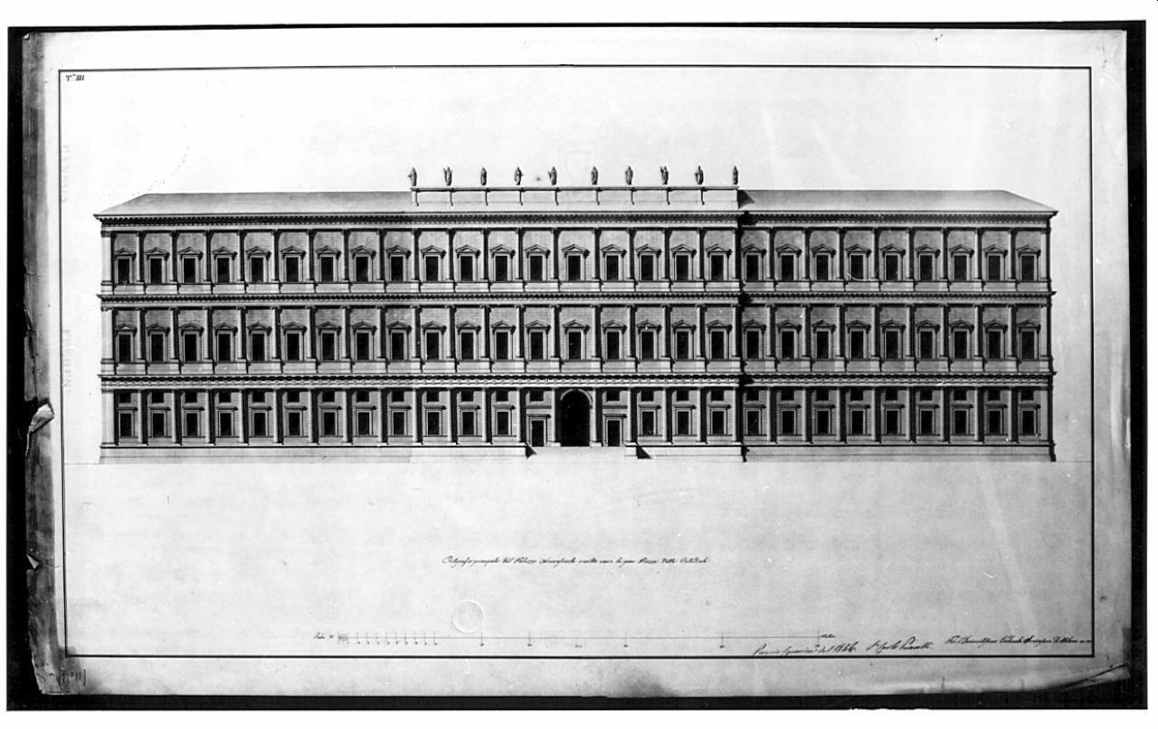 - NOTIZIE STORICO CRITICHE La tavola appartiene al progetto presentato da Carlo Peverelli, allievo dell' Accademia, al concorso Canonica del 1846. Peverelli ottenne il premio sia nel 1846 con il Progetto di un Palazzo Vescovile, sia nel 1853 con il progetto di un'Università. Le tavole del concorso Canonica sono conservate nella cartella 15 (Gabinetto dei disegni dell' Accademia). Carlo Peverelli fu premiato per il progetto di un cimitero presentato al concorso di seconda classe per l'invenzione di architettura nel 1837. (Le tre tavole rono conservate nel Gabinetto dei disegni della Biblioteca dell'Accademia nella cartella A I 194 contenente i saggi di seconda classe).