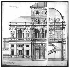 La tavola contiene: a sin. particolare con ombreggiature eseguite a tratteggio di un edificio con portico preceduto da scala, e lateralmente corpo più basso con finestre rettangolari al pt.; a ds particolare in sezione del vano scala illuminato da finestre ad arco al piano superiore e con copertura a volta con aperture circolari.