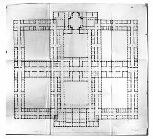 Pianta di edificio con murature campite a china e cortili interni acquarellati in verde chiaro. Pianta simmetrica quadrangolare con corpi in leggero aggetto posti al centro del lato inf. e del lato sup. All'interno 6 cortili quadrati. Edificio ecclesiastico a pianta centrale posto al centro del lato sup.