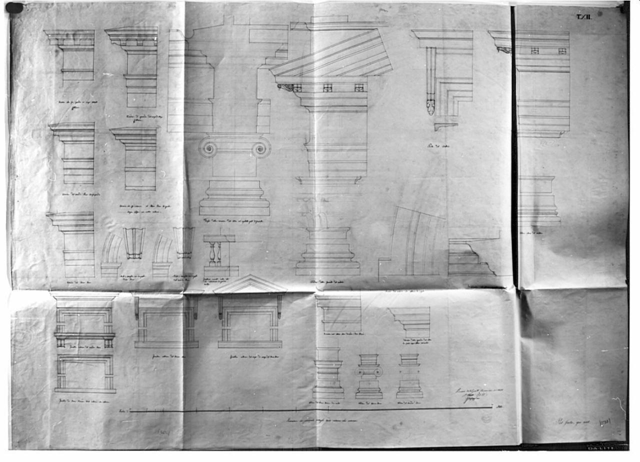La tavola contiene una serie di particolari architettonici a china, con murature sezionate campite in acquerello rosa. In alto a destra particolari dei comicioni, al centro particolare del capitello e della congiunzione tra muratura e copertura. Inferiormente a sinistra dettagli di cornici di porte e finestre; a ds dettagli di pilastri (basi e capitelli).