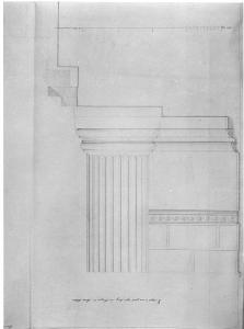 Sezione trasversale del portico esterno. Le linee di sezione sono sottolineate con bistro grigio. Inferiormente: sezione sul basamento, con ricostruzione, si tratto, delle porzioni di gradini mancanti. Superiormente: a sinistra profilo della parete esterna della cella, al centro parete fondale a bozze squadrate, con alto zoccolo liscio modanato inferiormente e coronato superiormente da fregio a serraglie. A destra, sopra lo stilobate, base e fusto scanalato di colonna.
