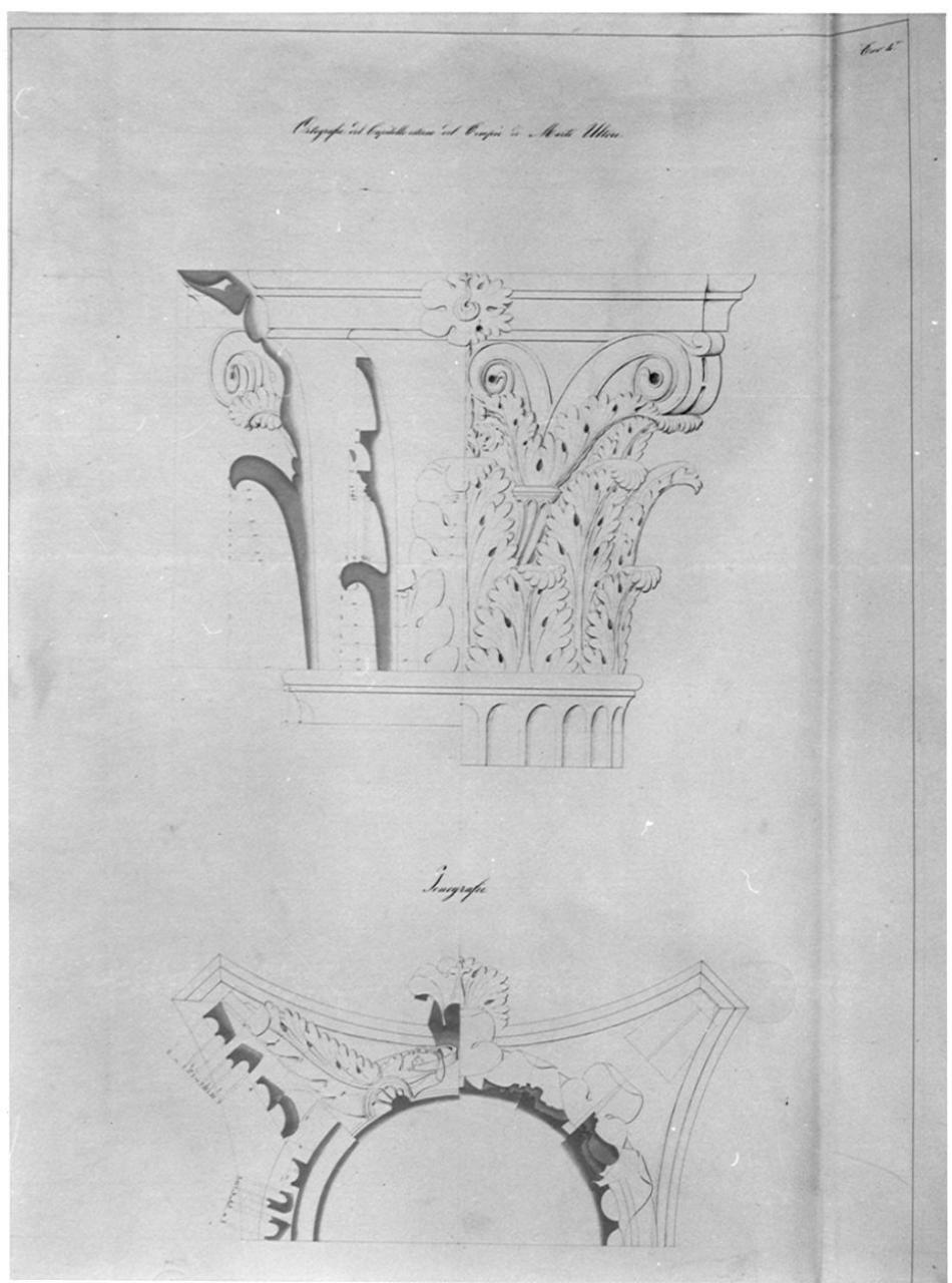 Rilievi degli avanzi del Tempio di Marte Ultore ed annesso foro (con progetti di restauro). architettura: tempio di Marte Ultore (prospetto e sezione di capitello)