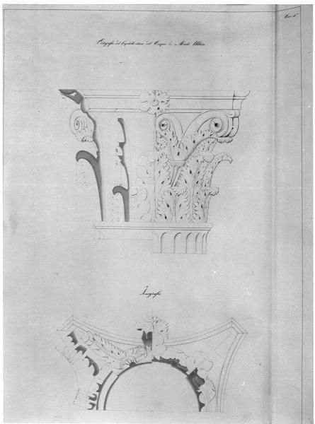 Serie di due disegni sovrapposti (cfr. scheda n. 0300085437). Le linee di sezione sono sottolineate con bistro grigio. Inf: icnografia di metà capitello, suddivisa in 6 settori circolari corrispondenti a differenti quote di sezione, dall'imoscapo (a ds.) fino ai caulicoli (a sin.), con veduta rivolta verso l'abaco curvilineo. Sup.: prospetto di metà capitello corinzio, alla destra dell'asse di simmetria verticale; alla sinistra, due sezioni radiali, ribaltate, tagliate l'una su una foglia d'acanto inferiore, l'altra su una foglia superiore sotto i caulicoli.