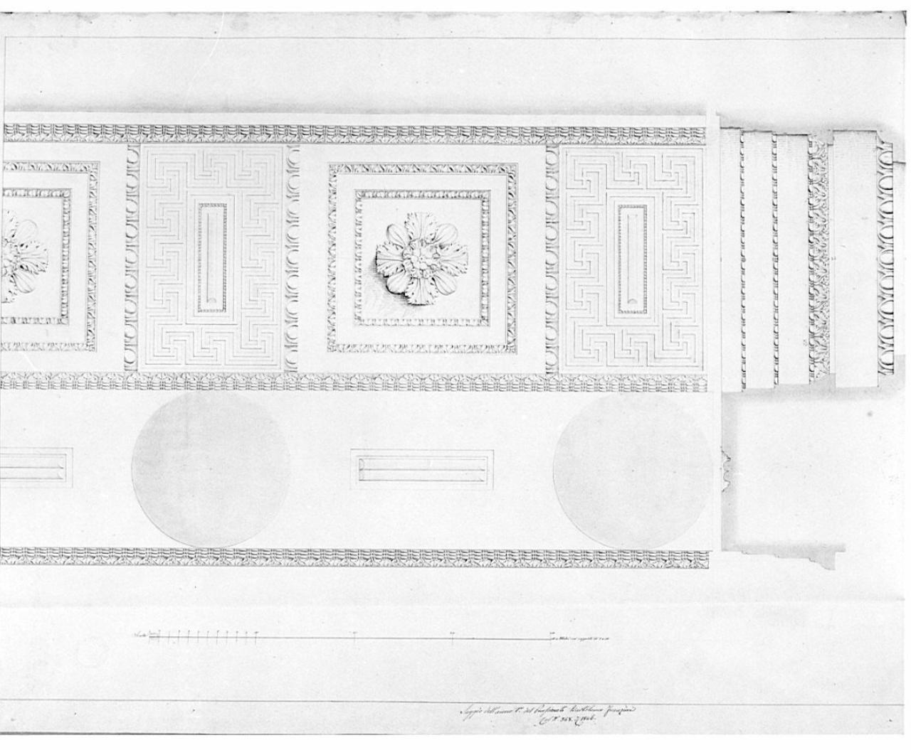 Pianta di una porzione di soffitto corrispondente ad un intercolumnio e mezzo; sezione sull'intercolumnio (cfr. scheda n. 0300085440). I profili delle linee di sezione e le basi circolari di appoggio delle sottostanti colonne sono colorati con bistro grigio chiaro. Pianta: 3 cornici orizzontali, con foglie e fusarole delimitano in due campi il soffitto. Sup: i lacunari quadrati con due cornici concentriche e grande fiore al centrano si alternano a tavelle rettangolari con decorazione geometrica a greca; una cornice a ovuli scandisce verticalmente il ritmo di quadrati e rettangoli. Inf. È disegnato il soffitto dell'intercolumnio, con le basi di appoggio delle colonne e piccoli lacunari rettangolari.