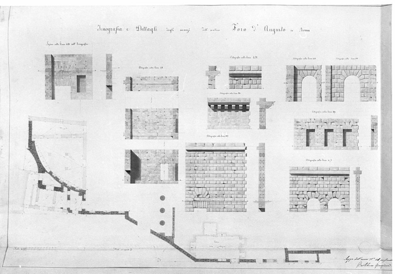 Rilievi degli avanzi del Tempio di Marte Ultore ed annesso foro (con progetti di restauro). architettura: Foro di Augusto (Planimetria generale, prospetti e sezioni di particolari murari.)
