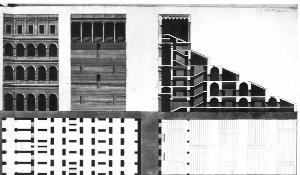 Serie di 5 disegni colorato a bistro. Le planimetrie sono su fondo marrone; prospetto e sezione su fondo azzurro. Inf. sin.: pianta p.t. di una porzione di gradinata in corrispondenza di un ingresso del portico esterno, con scalinata e botteghe; setti portanti, ambulacri e scale di accesso ai pp. superiori. Inf. ds.: planimetria delle gradinate e della galleria al piano superiore. Sup. sin.: prospetto esterno a 4 pp., con tre ordini di arcate sormontate ad un p. con finestre rettangolari separate da lesene coronate da trabeazione e balaustra. Sup. al centro prospetto gradinato a 5 pp.. All'ultimo livello portico con colonne lisce dal capitello corinzio, sormontate da trabeazione e balaustra. Sup. ds.: sezione trasversale sull'ingresso dall'esterno, sulle scale di salita ai 5 pp. e sul loggiato dell'ordine superiore, con soffitto a cassettoni.