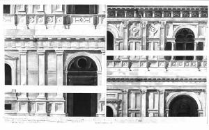 Serie di 4 disegni colorati a bistro grigio chiaro su fondo azzurro. I dettagli rappresentano i tre ordini architettonici del prospetto nella zona angolare di raccordo tra il corpo centrale e l'ala sinistra della facciata. A sinistra inf.: zoccolo con basi delle lesene; finestre della cantina (sin.) e varco del portico (ds.) al p.t.. A sin. sup. finestra ad arco sormontata da timpano; lesene lisce con capitello dorico; apertura archivoltata del portico (p.t.). Superiormente trabeazione dorico e fascia marcapiano del p. 1°, con basamento lesene e davanzali ornati da motivi geometrici. A ds. inf.: finestra, lesene con capitello ionico e arcata della loggia al p. 1°. Superiorm. Trabeazione ionica con fregio liscio, sormontata dalla fascia dei davanzali e dei basamenti delle lesene al p. 2°. A ds. sup. finestra ad arco con lesena con capitello corinzio, e serliana della loggia, al p. 2°. Superiorm. Cornicione con mensole e fascia sottogronda con motivi geometrici.