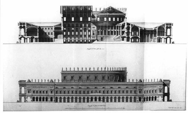 Prospetto del lato sinistro e sezione del Teatro. Prospetto in color grigio con ombreggiature più scure. La facciata laterale ha il piano porticato. Il primo piano con ampie finestrature e lunette è sormontato, nella parte centrale, da un cornicione con statue e trionfi scolpiti. Al centro veduta del tamburo finestrato sormontato da statue. Lateralmente veduta del fianco dei due ingressi principali. Sezione longitudinale con vista della platea, della cavea, delle quinte e dei locali attigui.