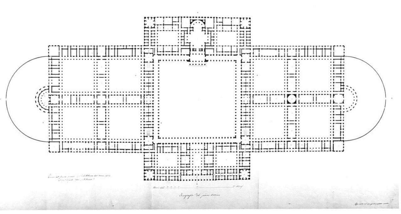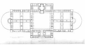 Pianta del piano terreno di un Ospedale. Disegno eseguito a china. I locali sono contrassegnati da un numero di riferimento ad una legenda. Pianta simmetrica formata da un corpo rettangolare con grande cortile quadrato e due corpi laterali suddivisi, a loro volta, in quattro cortili quadrati. Le due ali laterali terminano con due corti semicircolari cintate da un muro. Sul lato opposto all'ingresso principale è posta la cappella a pianta centrale.