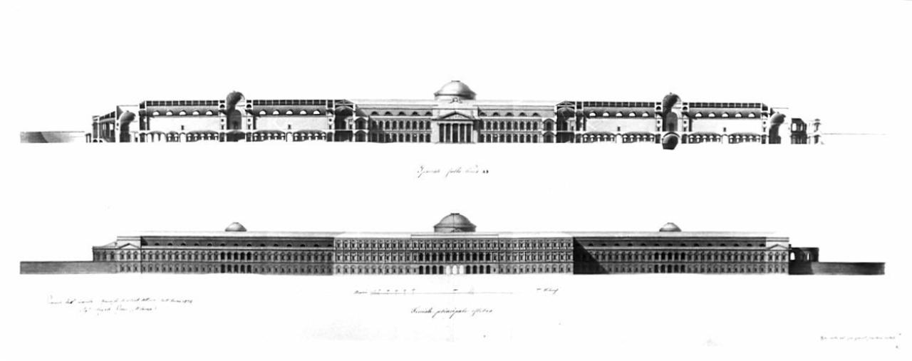 Prospetto principale eseguito a china, bistro e acquerello azzurro per le coperture. Sezione lungo la linea AB in china, bistro e acquerello rosa e giallo. Prospetto principale a tre piani con piano terra bugnato, veduta del corpo centrale e della cupola della cappella. Vista delle due cupole poste all'incrocio dei corridoi dei corpi laterali. Superiormente sezione del cortile centrale interno e prospetto della cappella.