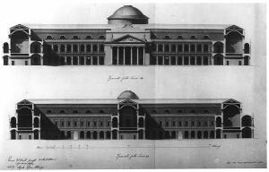 Sezione lungo la linea EF eseguita a china, a bistro e acquerello rosa e giallo per le parti sezionate e azzurro per le coperture. Sezione su uno dei corpi laterali con vista delle facciate interne e sezione dei corridoi. Superiormente sezione lungo la linea CD illustrante il prospetto della cappella con pronao esastilo e cupola ribassata, prospetti dei portici e loggiati laterali e sezione sulle ali.
