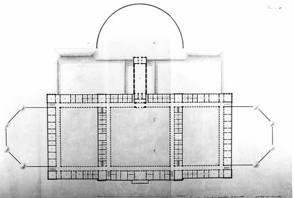 Pianta del piano superiore in china e bistro. Vista delle coperture coniche delle torrette di guardia poste sui muri di cinta delle piazze di armi laterali. Vista delle coperture degli edifici adiacenti la grande piazza d'armi semicircolare. Sezionati 3 cortili (2 rett., 1 quadrato centrala) sugli ambienti prospicienti.