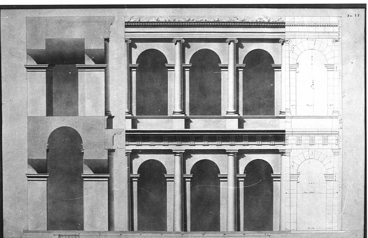 Prospetto e sezioni di 3 arcate a doppio ordine, su fondo azzurro-grigio chiaro, entro margine grigio scuro. Al centro: prospetto con arcate inf. comprese fra semicolonne lisce doriche reggenti architrave e metope. Sup. le arcate sono comprese fra semicolonne ioniche, reggenti architrave a molteplici cornici (sup. dentellata e di marmo). A sin.: sezione a rilievo. A ds.: dis. della sezione.