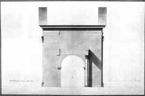 Prospetto del fianco sinistro dei portici d'Ottavia, colorato a bistro, compreso entro margine grigio scuro. Al centro è aperto da portale architravato: l'arco, profilato, poggia su coppia di mensole con rosette, ed è affiancato da colonna composita liscia. La testata sopra di questa e quella corrispondente sono acquerellate di rosa. Piloni compositi laterali con architrave a cornici aggettanti, risvoltante superiormente: su quest'ultima poggiano i due timpani laterali. Il rilievo di alcuni dettagli è descritto nella scheda n. 0300085688.