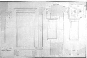 Prospetti disegnati a china della porta (sin.), di una finestra (est. e int.) e del soffitto (a lacunari con rosette centrali) del Tempio di Vesta a Tivoli. Le rispettive sezioni, poste superiormente ed inferiormente, sono acquerellate di arancione. La porta e la finestra sono profilate da cornicette, e sormontate da architrave e cornicette aggettanti. La finestra poggia su basamento rettangolare profilato da cornicette.
