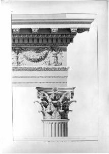 Dettaglio di trabeazione a china e bistro con ombreggiature più scure. Capitello e trabeazione corinzia secondo Vignola. Capitello a foglie, volute e con cimazio con apofige dell'abaco. Architrave a fasce sormontato da fregio ornato da festosi e candelabri; cimazio a gola rovescia, cornicione a mensole, echino con ovoli, modiglioni e cassettone con cornice ed echino con ovoli e frecce.