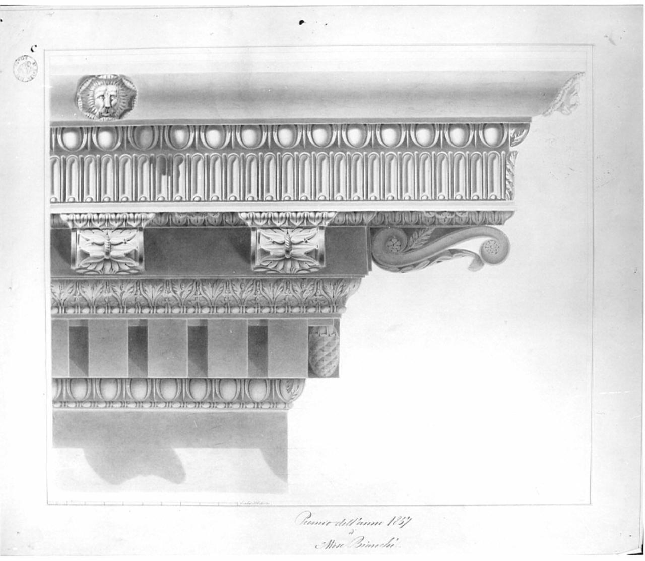 - NOTIZIE STORICO CRITICHE Disegno premiato nel 1857 nel concorso di II classe per il disegno degli ordini. Dal 1810 il concorso di II classe ammette due premi (medaglia d'argento): uno per l'invenzione e uno per il disegno degli ordini. La tavola è conservata nella cartella A I 194 che contiene i saggi premiati nei concorsi di II classe per l'invenzione e per il disegno degli ordini.