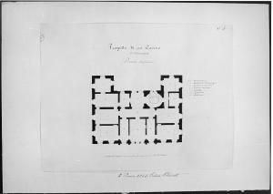 Pianta del piano superiore di edificio a china con numeri di riferimento a legenda posta a ds. del disegno. Edificio simmetrico, con ali aggettanti sul lato sup. All'interno serie di vani rettangolari. Scala elittica posta a ds. dell'anticamera (posta al centro del lato sup.) che distribuisce i locali del piano superiore.