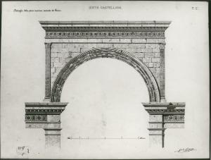 Rilievo dell'alzato della parte centrale del Portico della cattedrale a china con effetto chiaroscurale ottenuto da vari tipi di tratteggio. Alzato di arco a tutto sesto con vista dell'imposta e delle decorazioni alto medievali. Segnalato lo stato di degrado della cornice dell'arco e delle pietre dell'attico che sostengono la ricca cornice composta da fregio, dentelli e sima.