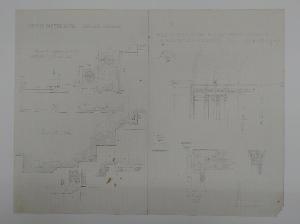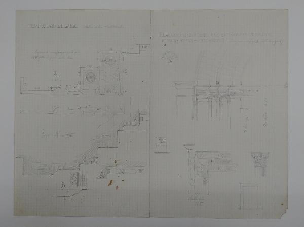 Serie di schizzi quotati a matita su foglio quadrettato chiaro.\nSin.: Sezione dell'imposta e sezione del portico della cattedrale.\nDs.: Alzati della cornice della porta di capitello corinzio e di parte della strombatura del portale.
