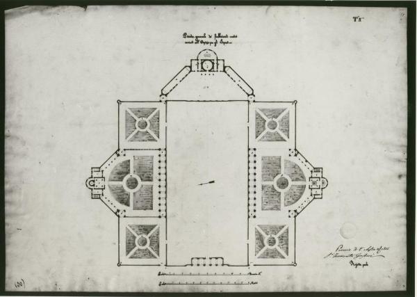 Pianta di edifici a china, bistro e acquerello rosa e azzurro su fondo chiaro.\nSerie di edifici adibiti a servizi delimitati da muri che recingono anche gli orti.\nA ds. e sin. vani con attigue scale di accesso ai piani sup.\nAl centro sup. sala circolare ed esedra.\nSezioni delle murature a china rosa.