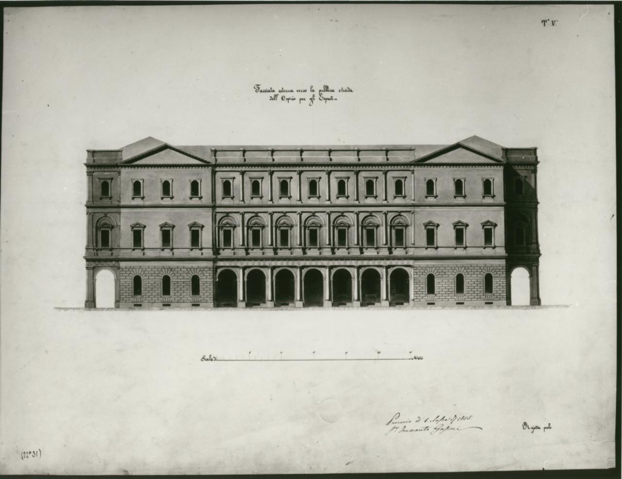 - NOTIZIE STORICO CRITICHE Il disegno fa parte di una serie di 9 tavole redatte da Gasoni Innocente nel 1855 per il concorso di I classe dal tema "Ospizio per gli esposti e per le partorienti povere e paganti; qual si conviene ad una popolosa città centrale" (Atti..., 1855, p. 32).\nIl progetto esaminato dalla Commissione giudicatrice venne ritenuto degno di essere premiato nonostante non rispondesse a pieno alle richieste. (Atti..., 1855, p. 33).\nI disegni sono concervati nella cartella 16 che raccoglie i saggi di concorso di I classe.\nGasoni Innocente, allievo dell'Accademia aveva vinto nel 1854 il secondo premio per l'invenzione nel concorso di II classe della scuola d'architettura (Atti..., 1854, p.25) e il primo premio per gli elementi nel concorso di II classe della scuola di prospettiva (Atti..., 1854, p.25).