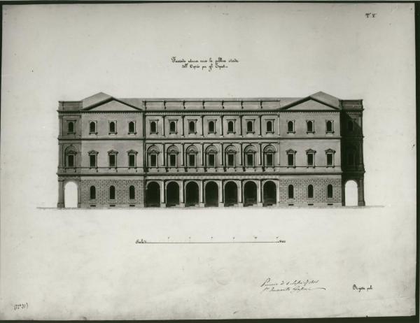 Alzato di edificio a tre piani a china e bistro con leggere campiture marrone chiaro, su fondo chiaro.\nProspetto verso la pubblica strada di edificio adibito a Ospizio con vista di sette archi centrali finacheggiati da colonne tuscaniche e corpi di fabbrica a bugnato. Piani sup. con aperture simmetriche timpanate. Ultimo piano con aperture modanate con mensole e terminante con attico. Vista dei fianchi degli avancorpi a ds. e sin.