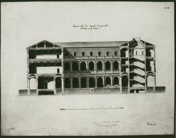 Sezione di edificio a china, bistro e acquerello rosa e marrone chiaro, su fondo chiaro. \nSpaccato trasversale sul cortile con vista del porticato, della loggia sup. e del terrazzo del terzo piano dell'edificio.\nSin. vista dei vani con copertura a vela e capriata sup., a sin. vista del vano scala con lucernaio centrale. \nEvidenziati canali di scolo sotterranei delle fognature.