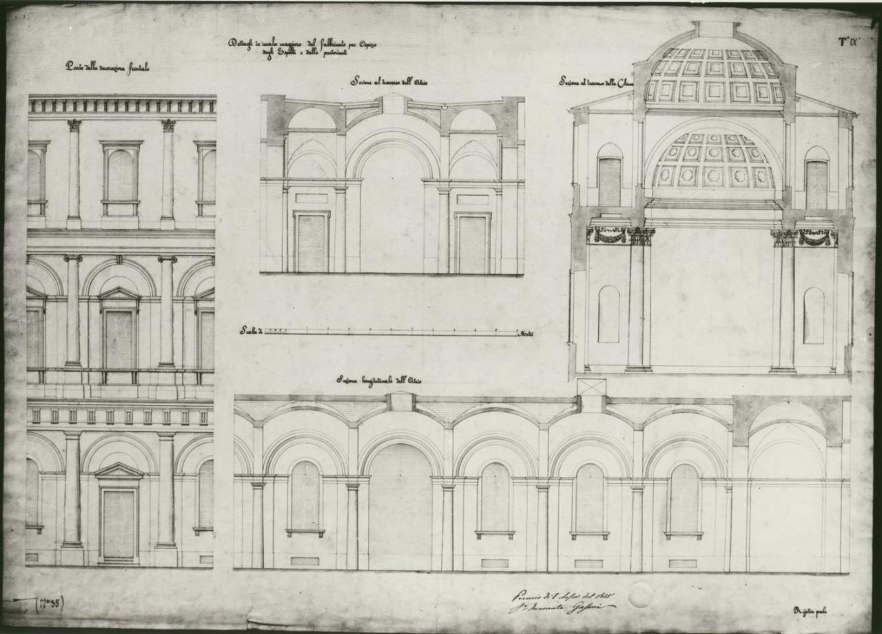 Serie di quattro disegni di sezioni e prospetto a china, tratteggio e acquerello rosa, su fondo chiaro.\nInf.: sezione longitudinale dell'atrio dell'Ospizio con aperture ad arco. \nSin.: dettaglio della decorazione ad ordini sovrapposti del prospetto.\nSup. al centro: spaccato dell'atrio con vista del vano con volta a lucernaio centrale e delle volte a vela adiacenti.\nDs.: sezione della cappella religiosa con colonne corinzie e decorazioni a festoni, sormontata da doppia calotta di cupola cassettonata.