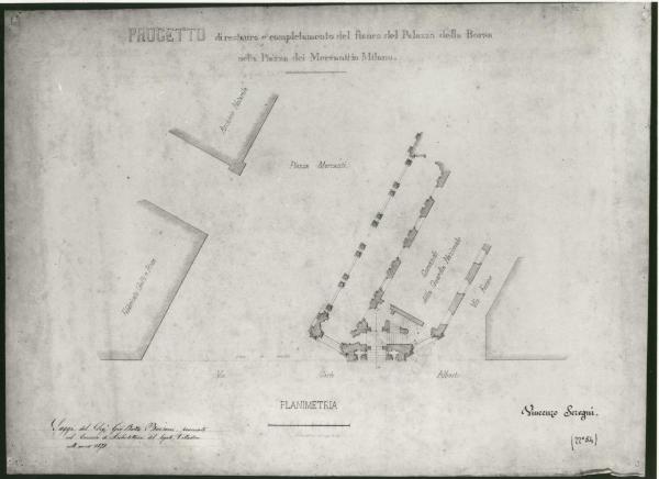 Restauro e completamento del fianco del Palazzo della Borsa nella Piazza de' Mercanti... Il prospetto dovrà essere in armonia col partito architettonico della facciata del palazzo stesso verso la piazza. architettura: palazzo di Piazza dei Mercanti di Milano (planimetria)