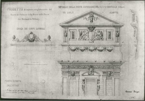 Restauro e completamento del fianco del Palazzo della Borsa nella Piazza de' Mercanti... Il prospetto dovrà essere in armonia col partito architettonico della facciata del palazzo stesso verso la piazza. architettura: palazzo di Piazza dei Mercanti di Milano (sezione e particolari)