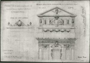 Cartoncino colore beige. La tavola contiene: a sinistra in alto il disegno di una cimasa con volute e stemma al centro; in basso la sezione orizzontale di una cornice; a destra il dettaglio di parte del piano superiore: finestra rettangolare sormontata da architrave con stipiti ornati da cariatidi. In alto dettaglio del frontone triangolare con bassorilievo e dettaglio delle cornici con stemma e festoni. A destra il profilo del frontone.