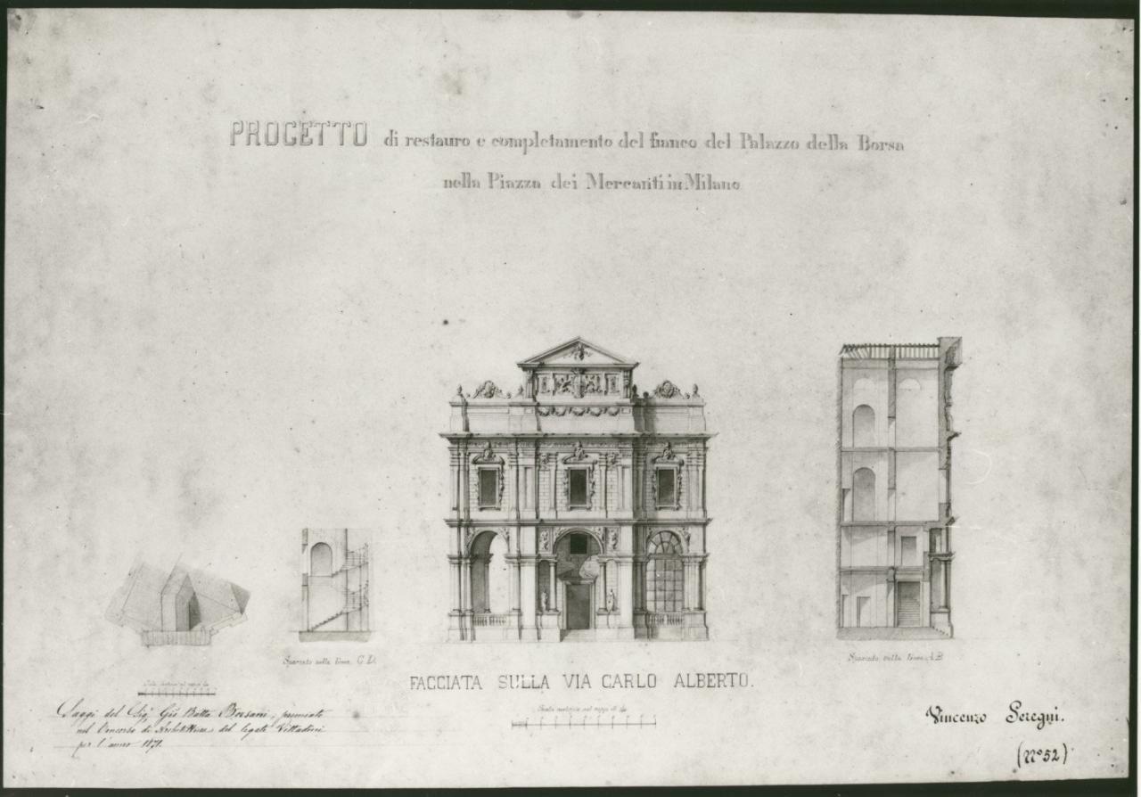 Restauro e completamento del fianco del Palazzo della Borsa nella Piazza de' Mercanti... Il prospetto dovrà essere in armonia col partito architettonico della facciata del palazzo stesso verso la piazza. architettura: palazzo di Piazza dei Mercanti di Milano (pianta, prospetto e sezione)