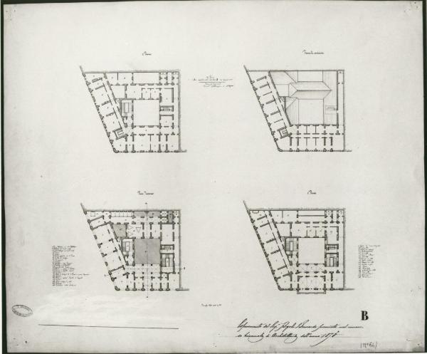 Cartoncino colore beige. Serie di 4 piante di palazzo a china nera.\nIn basso a sinistra pianta del Piano terreno: edificio trapezioidale ad uso abitativo, con cortile centrale quadrato campito con tratteggio obliquo. Ai lati del cortile a sinistra una rampa di scale e a destra due rampe di scale. Sulla linea C D, l'ingresso e l'atrio di distribuzione agli ambienti circostanti. A sinistra e sul lato superiore cavedi campiti con tratteggio obliquo. All'interno dei vani numeri di riferimento alla leggenda posta a sinistra del disegno. \nIn basso a destra primo piano: pianta di edificio trapezioidale con cortile centrale quadrato. All'interno dei vani numeri di riferimento alla leggenda posta a destra del disegno. \nIn alto a sinistra pianta del secondo piano: edificio trapezioidale con cortile centrale quadrato. \nIn alto a destra pianta del piano superiore con vista delle coperture a falda.