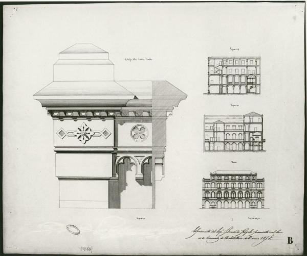 - NOTIZIE STORICO CRITICHE Disegno di Bernardo Rigoli (serie di 5 disegni) eseguito per il concorso triennale di architettura del 1873 (Atti regia 1873, pp. 65).\nIl disegno è stato premiato dalla commissione composta da: L. Bisi, C. Bernacchi, C. Clericetti, G. Brocca, A. Sacchi.\nIl giudizio della commissione è conservato negli Atti dell'Accademia del 1873 (TEA G. IV 20).\nBernardo Rigoli, inoltre, espose nel 1869 per la scuola superiore di Architettura, ed è segnalato nel 1870. Nel 1874 vinse il Premio Vittadini con il progetto di un mercato coperto.