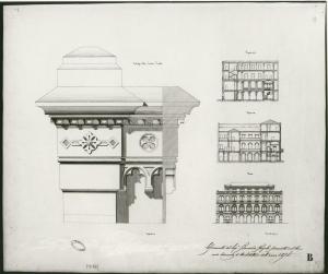 Da sinistra al centro, particolare di cornice di edificio a china con ombreggiature a tratteggio. Il particolare è costituito da prospetto e da sezione campita a tratteggio obliquo. La cornice è composta da decorazioni floreali e geometriche, archetti pensili trilobati e cornice a dentelli. \nA destra della tavola tre alzati di edificio a china con parti sezionate a tratteggio obliquo.