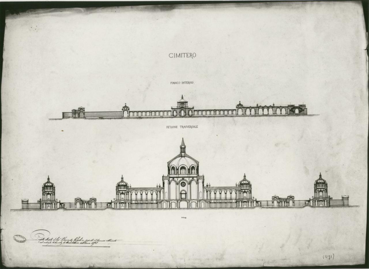 Cimitero per un città di 14000 abitanti, con chiesa, portici, edicole, cappelle ed i relativi locali di servizio. architettura: cimitero (prospetto e sezione)