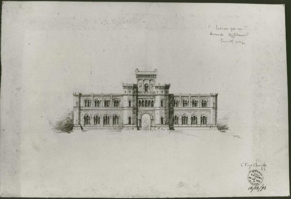 Prospetto di edificio a matita con ombreggiature. Edificio simmetrico a due piani con portale centrale ad arco e lateralmente torrette poligonali. Superiormente loggia a 5 arcate sormontata da torretta. Al piano terra, ai lati del portale, serie di 4 trifore entro arco. Al primo piano, serie di 4 bifore sormontate da timpano triangolare. Coperture piane.
