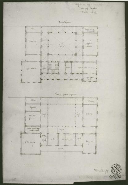 Disegno a matita delle piante di un edificio rettangolare con corte interna porticata. Murature sezionate campite a tratteggio. In alto pianta del piano terreno: edificio con porticato al centro del lato inferiore, con corpo aggettante sul lato inferiore a sinistra. In basso pianta del piano superiore con vista della loggia. Indicazione funzionale all'interno dei locali.