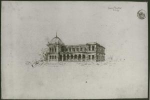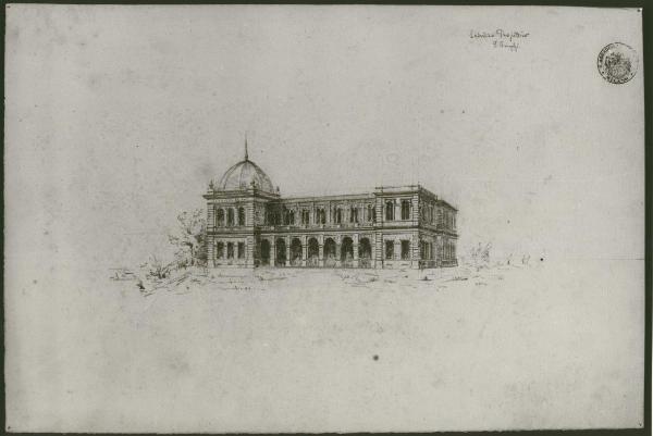 Prospettiva di edificio a matita con ombreggiature. Edificio a due piani con porticato al piano terra e concluso a sinistra da corpo in aggetto con copertura a cupola, e a destra da corpo aggettante con copertura piana.