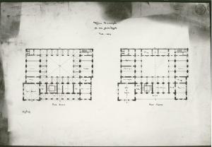 La tavola contiene 2 piante di edificio eseguite a china con murature sezionate campite in acquerello rosa. A sinistra pianta del piano terreno di edificio a forma quadrangolare con porticato esterno e corte quadrata porticata. A sinistra dell'edificio locale quadrato sporgente rispetto al perimetro dell'edificio. A destra pianta del piano superiore. All'interno dei locali descrizione delle destinazione d'uso.