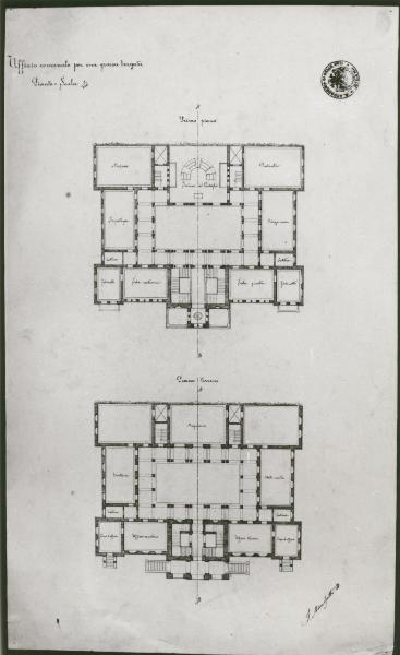 Progetto di edificio comunale a china con sezioni a tratteggio nero su fondo chiaro. \nInferiormente: pianta simmetrica del piano terreno con vista del pronao, del vestibolo con scale, cortile quadrangolare e serie di vani quadrangolari. \nSuperiormente: pianta del primo piano con evidenziata la sala del consiglio con emiciclo assembleare.