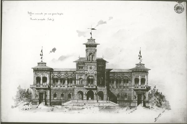 Alzato di edificio comunale a china e acquerello grigio, azzurro, marrone e giallino su fondo chiaro con campitura azzurra per il cielo e verde per il paesaggio. Prospetto di edificio a 2 piani con ingresso centrale su avancorpo centrale terminante a torretta sopraelevata. Piano terra a bugnato con vista del pronao e due ingressi laterali. Piano nobile con finestre bifore e copertura a falde. Ricca decorazione architettonica in stile eclettico.