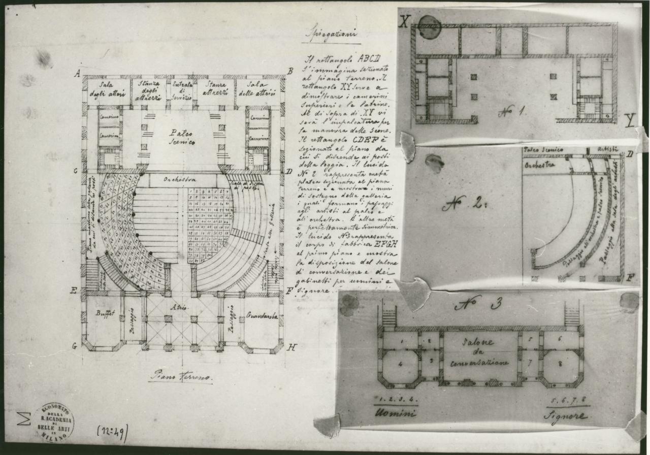 Progetto per edificio adibito a teatro. a matita su fondo chiaro con legenda a matita al centro e 3 particolari numerati su carta da lucido a matita incollati al foglio. \nSinistra: pianta del piano terreno del teatro con vista dell'atrio, della sala con gradinate e platea con posti numerati, palcoscenico con camerini laterali e vani di servizio per le attrezzature. \nInferiormente a destra: pianta del salone con gabinetti del piano superiore. \nAl centro a destra: pianta del palcoscenico e dei camerini.